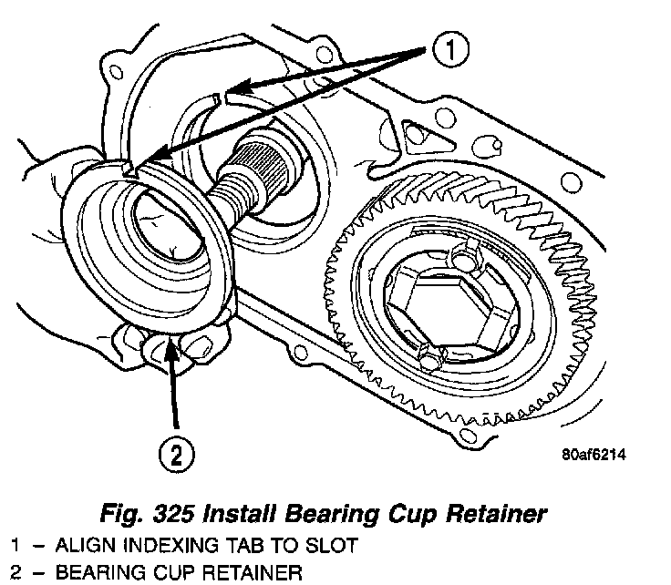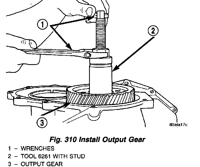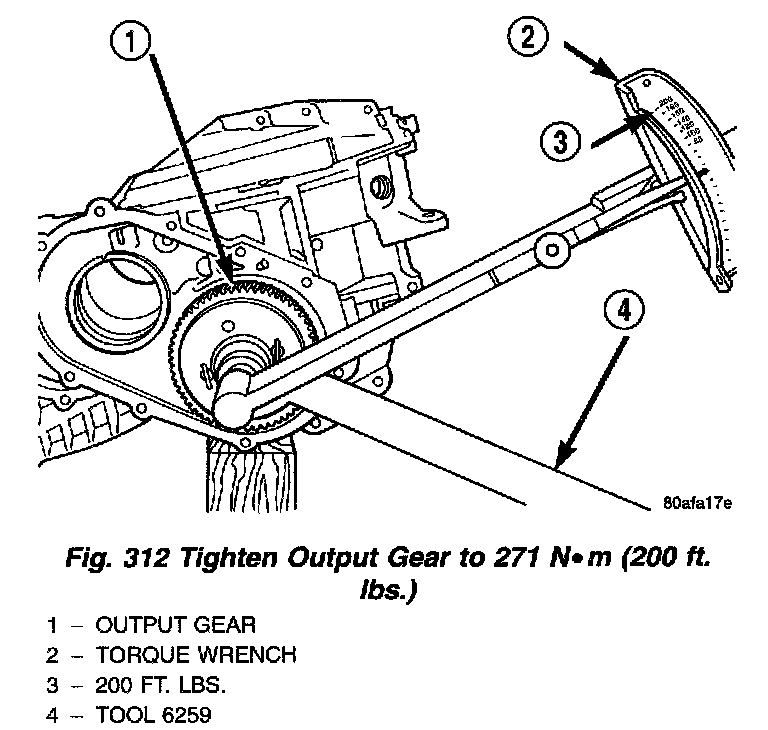 2. Using Tool 6259, install output gear and bearing assembly. Torque to 271 Nm (200 ft. lbs.). To measure bearing end play: