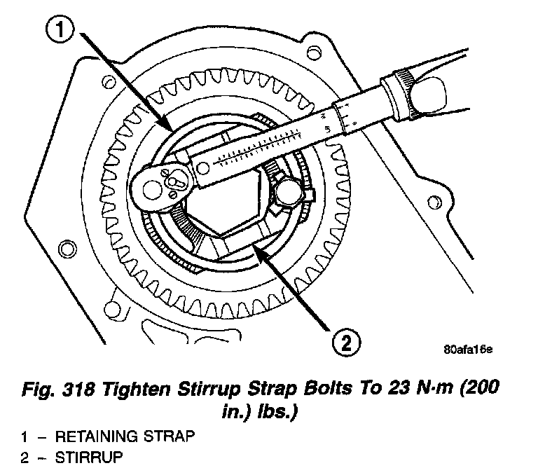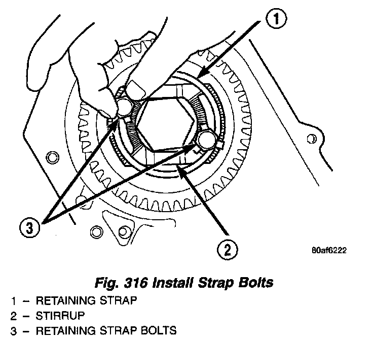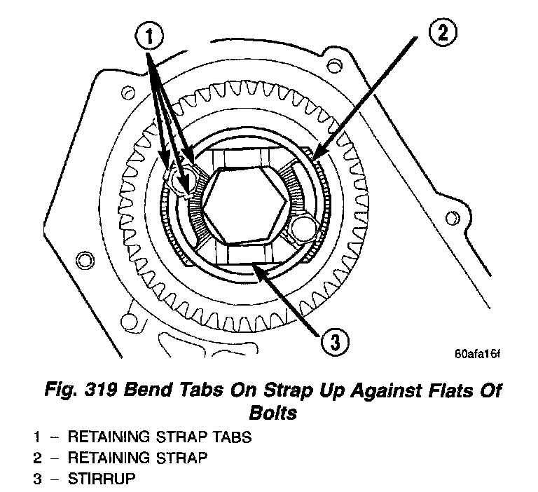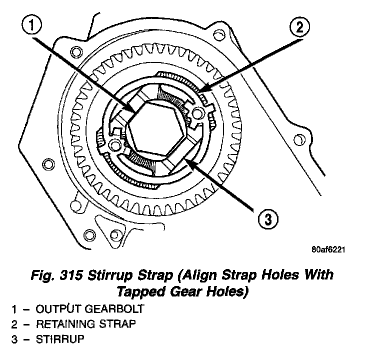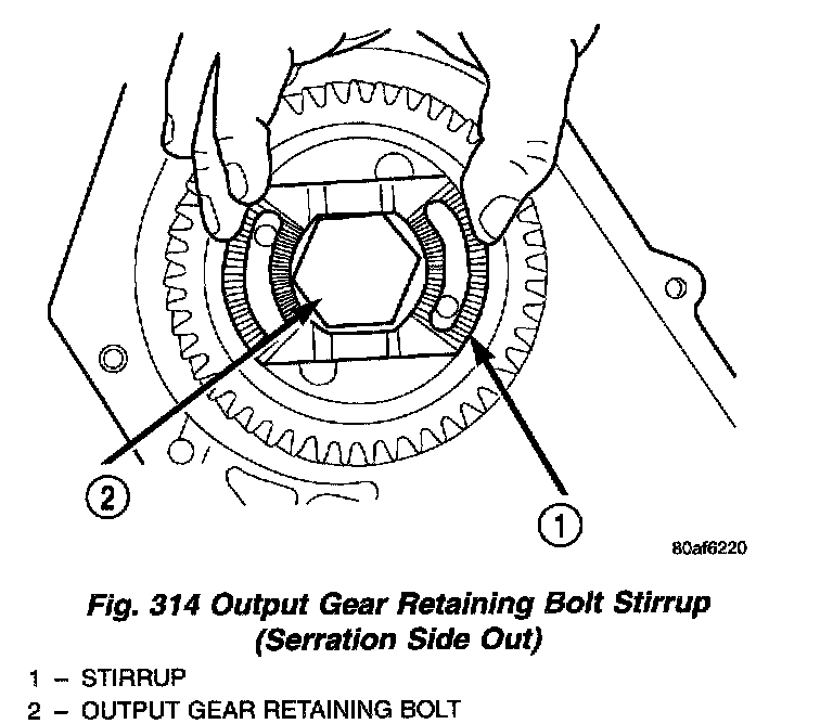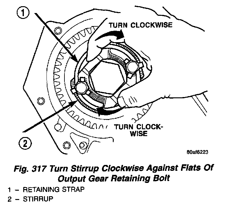 All transaxles utilize a stirrup and retaining strap that is attached to the output gear. The stirrup prevents the output gear retaining bolt from turning and backing out of the rear carrier. The strap is used to hold the stirrup to the output gear and prevent the stirrup retaining bolts from backing out.