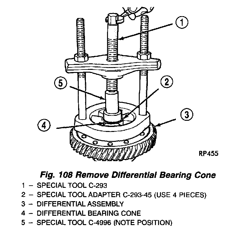 5. Using the smallest end play recorded, shim that side gear to within 0.001 to 0.013 inch. The other side gear should be checked using the same procedure.