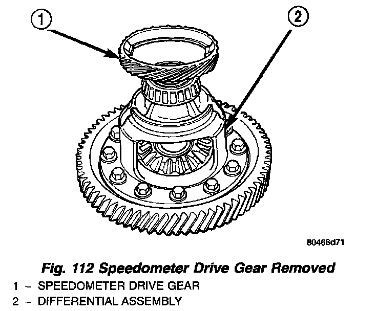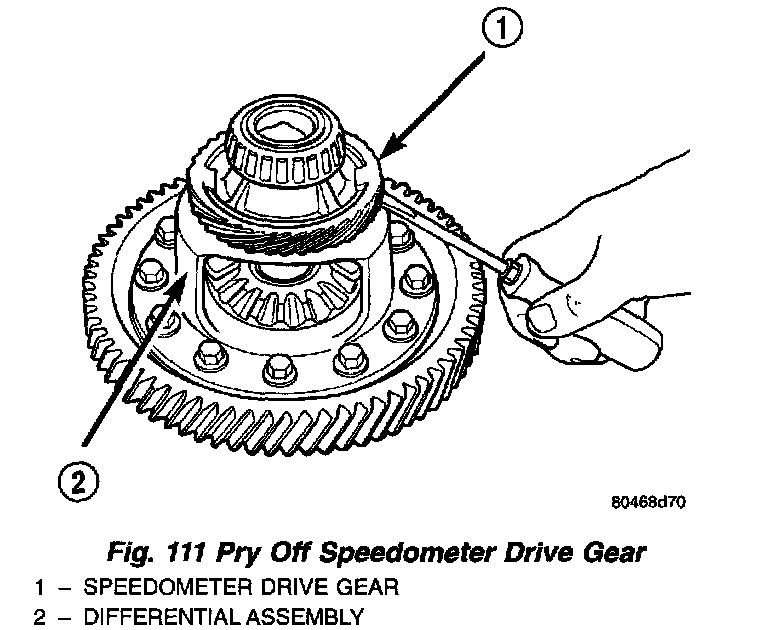 1. Pry the plastic speedometer drive gear off of the differential case using a flat blade pry tool (Fig. 111) (Fig. 112).