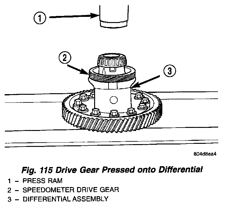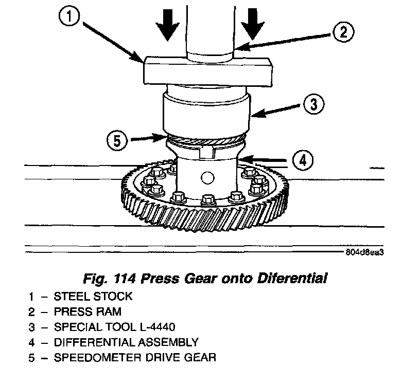 2. Using Miller Tool # L-4440 and steel stock, press speedometer drive gear onto differential (Fig. 114) (Fig. 115). Do not use a hammer.