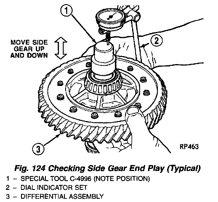 4. Set up dial indicator as shown and record end play (Fig. 123) (Fig. 124). Rotate side gear 90 degrees and record another end play. Again, rotate side gear 90 degrees and record a final end play.
