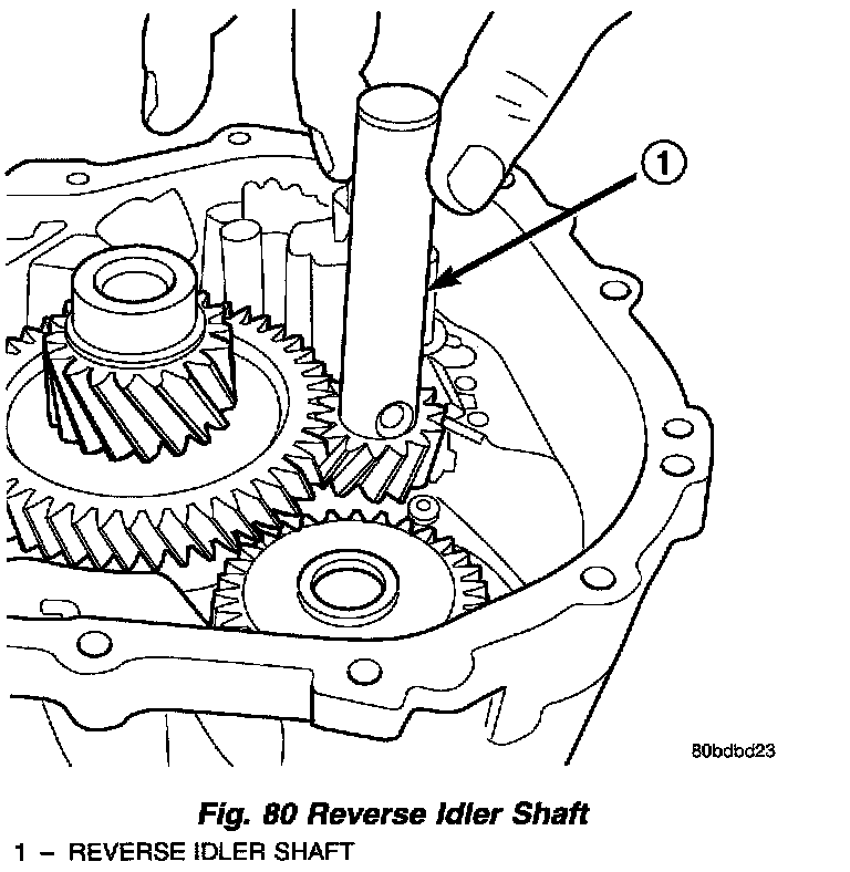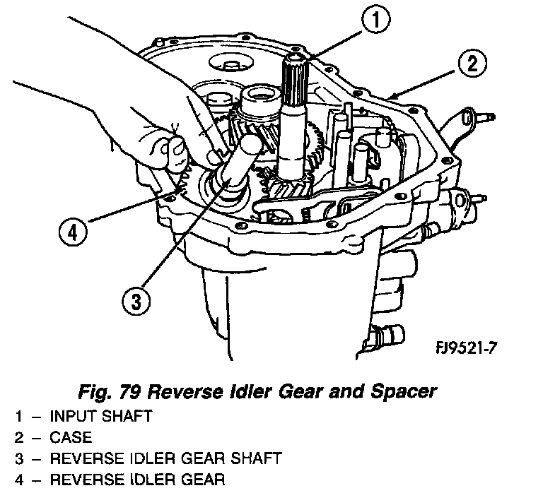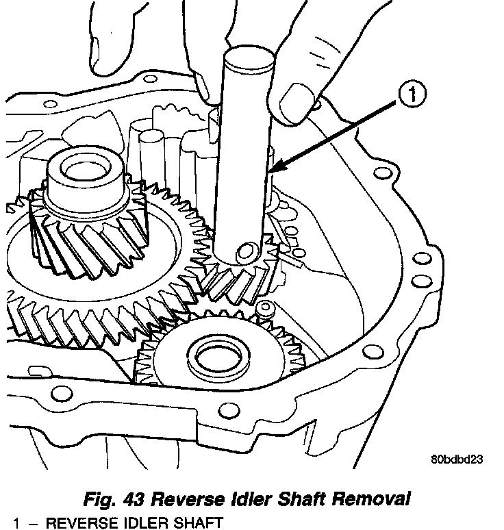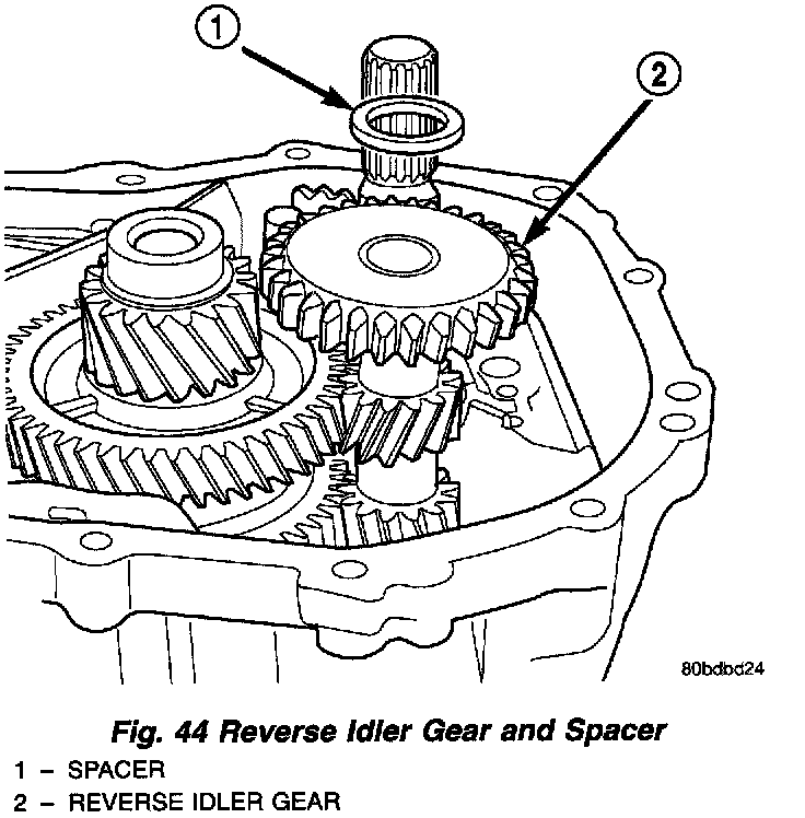 9. Remove reverse idler gear and spacer (Fig. 44).