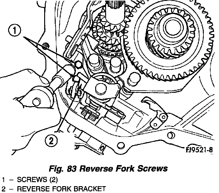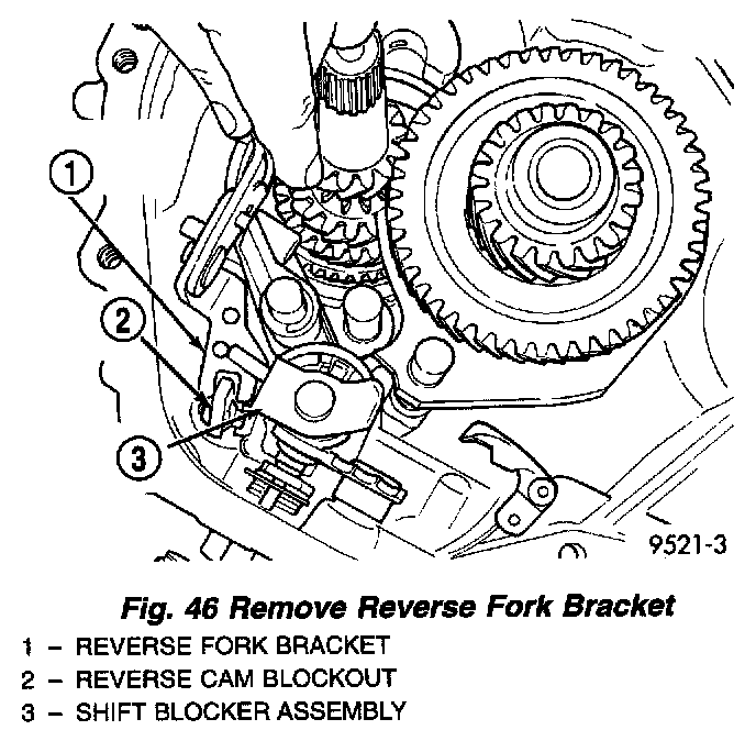 10. Remove two screws retaining reverse fork bracket (Fig. 45). Remove reverse fork bracket and bracket assembly (Fig 46)