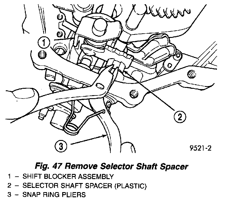 11. Using snap-ring pliers, remove selector shaft spacer (Fig. 47).
