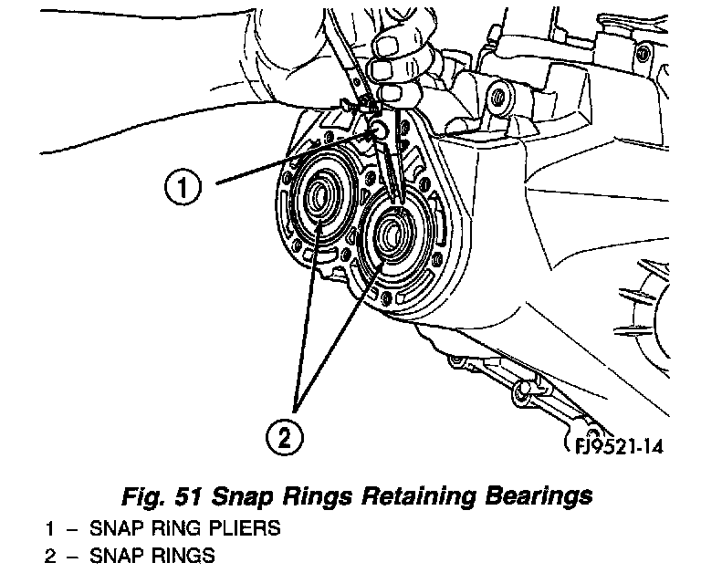 14. Remove two snap rings retaining the output shaft and the input shaft to the bearings (Fig. 51).