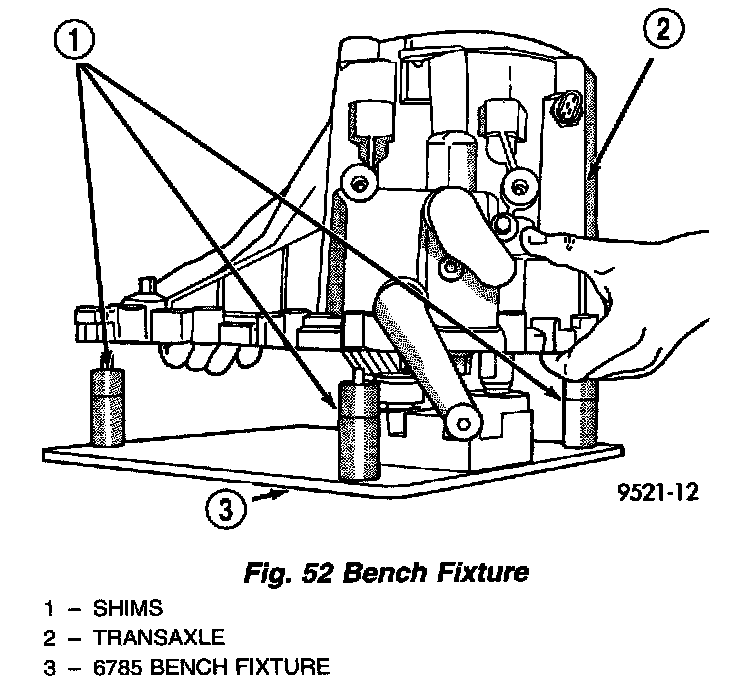15. Using bench fixture and shims provided (Miller tools # 6785, 6785-1, and 6785-2), turn transaxle over. Install transaxle onto bench fixture (Fig. 52). Verify shim spacers are in position on bench fixture. Install transaxle into shop press.