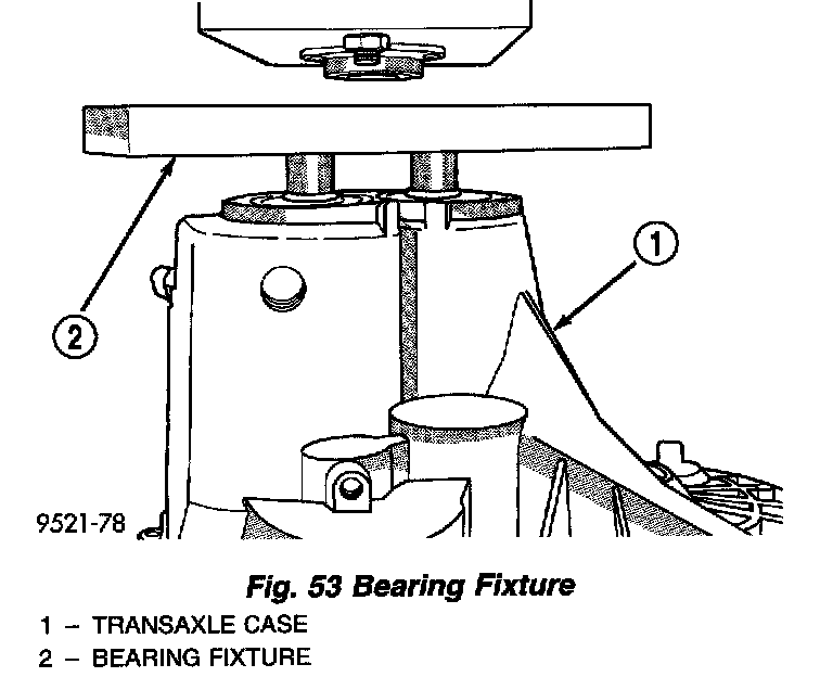 16. Install bearing fixture Miller tool #6768 onto transaxle end bearings (Fig. 53). Verify tool is properly aligned to input and output shafts.