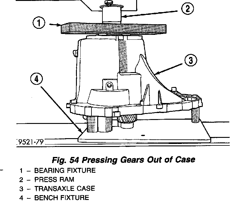 17. Install transaxle gear case into shop press. Press output and input shaft assemblies out of case (Fig. 54).