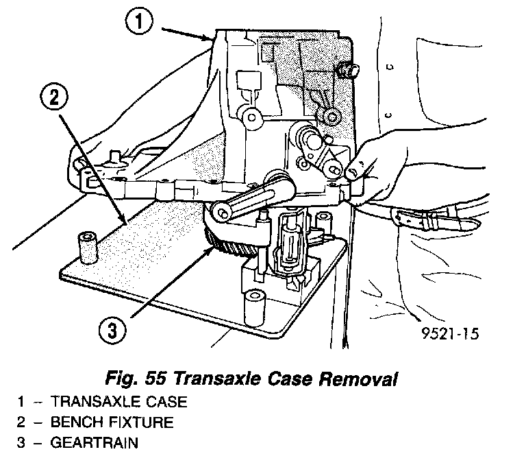 19. Carefully remove transaxle case from the shaft assemblies and bench fixture (Fig. 55). Be sure the oil-feed trough to the end bearings is not damaged (Fig. 56).