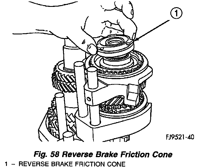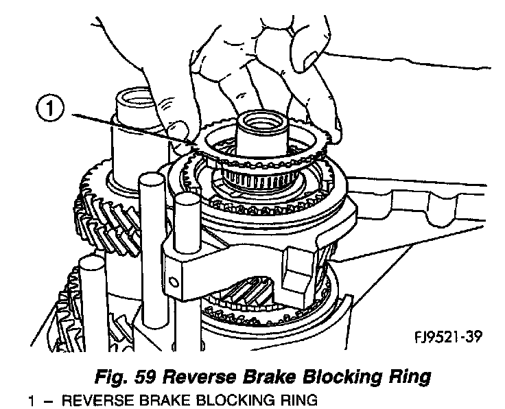 Remove the reverse brake blocking ring, shim, reverse brake friction cone, bearing and race from the input shaft assembly (Fig. 57) (Fig. 58) (Fig. 59) (Fig. 60) (Fig. 61).