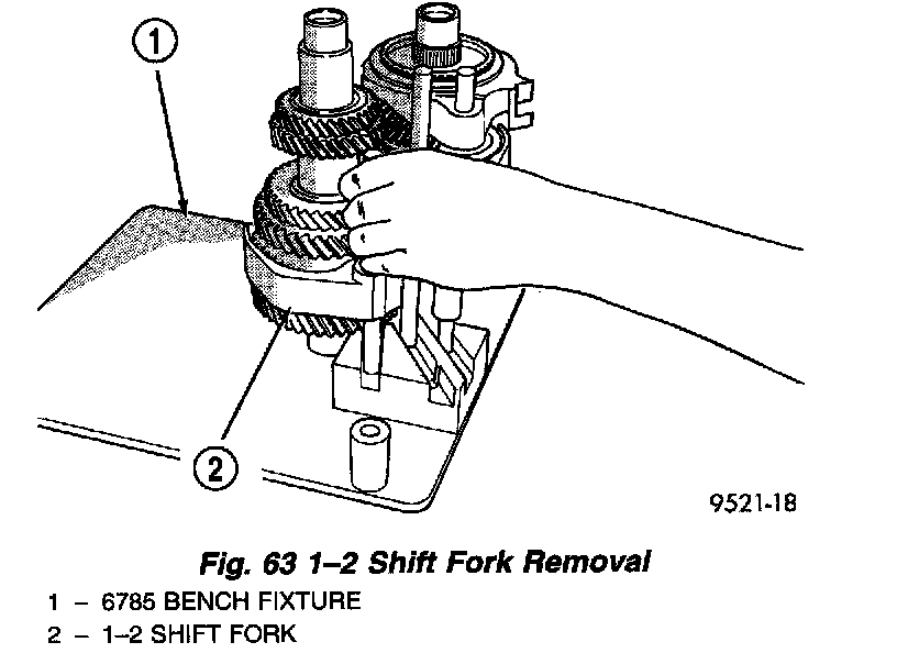 22. Remove the 1-2 shift fork from the output shaft (Fig. 63).