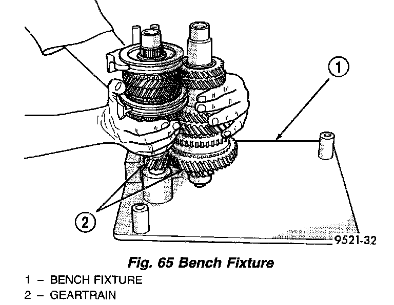 1. Verify bench fixture shims are removed from bench fixture. Install output and input shafts into bench fixture (Miller tool #6785) (Fig. 65).