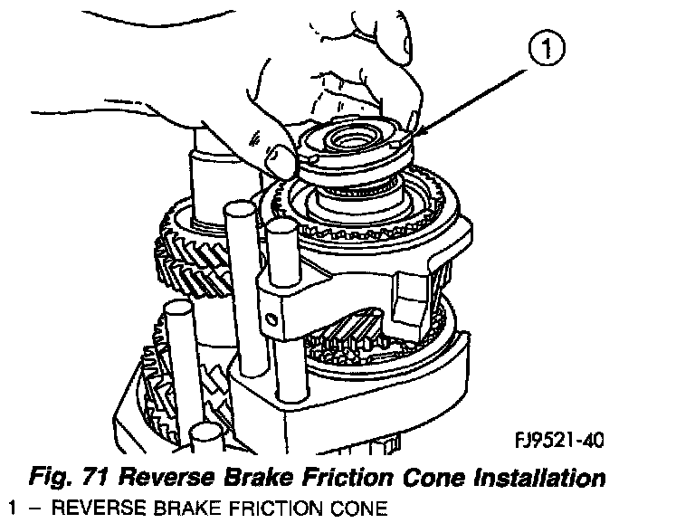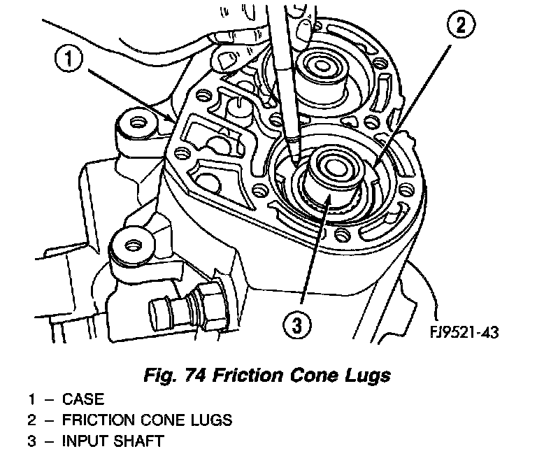 10. Line up reverse brake friction cone lugs to the slots in the gear case (Fig. 74). Verify reverse brake shim is in position.