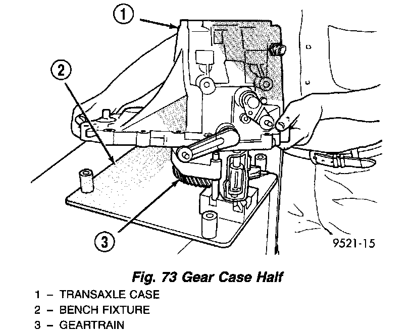 9. Install gear-case half over bench fixture (Fig. 73). Line up shift finger over 3-4 lug.