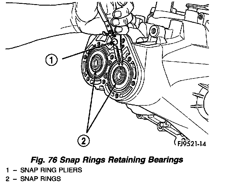 12. Install shaft snap rings at input and output bearings (Fig. 76).