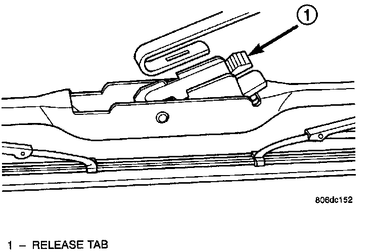 2. Remove blade assembly from arm by pushing release tab under arm tip and slide blade away from arm tip. Gently place wiper arm tip on windshield.
