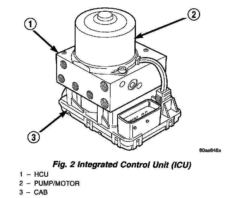 DESCRIPTIONThe Controller Antilock Brake (CAB) is a microprocessor-based device which monitors the ABS system during normal braking and controls it when the vehicle is in an ABS stop. The CAB is mounted to the bottom of the HCU. The CAB uses a 25-way electrical connector on the vehicle wiring harness. The power source for the CAB is through the ignition switch in the RUN or ON position. The CAB is on the CCD bus.