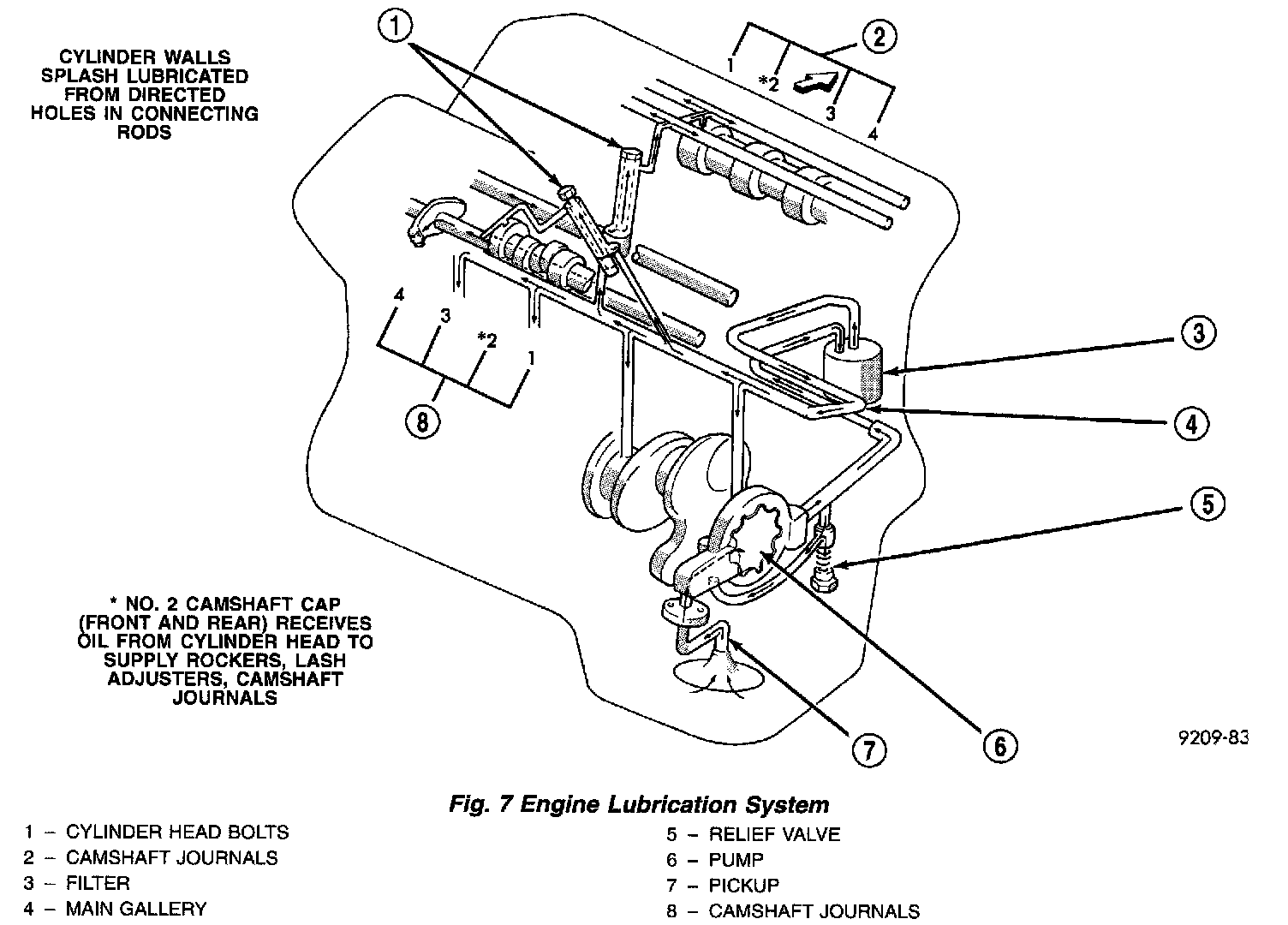 Engine oil, stored in the oil pan, is taken in and discharged the oil pump. Oil pressure is regulated by a relief valve located in the oil pump housing. The oil is fed through an oil filter and to the crankshaft journals from the oil gallery in the cylinder block. This gallery also feeds oil under pressure to the cylinder heads and camshaft journals. It then flows from the cylinder head passages to the rocker shafts to the rocker arm pivots and auto lash adjusters.