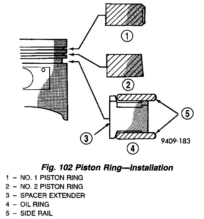 1. The No. 1 and No. 2 piston rings have a different cross section. Install rings with manufacturers mark and size mark facing up, to the top of the piston (Fig. 105).