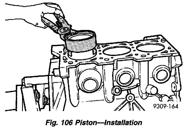 2. Install the side rails (upper rail first, then lower rail) by placing one end between the piston ring groove and the expander. Hold end firmly and press down the portion to be installed until side rail is in position. Do Not use a piston ring expander (Fig. 106).
