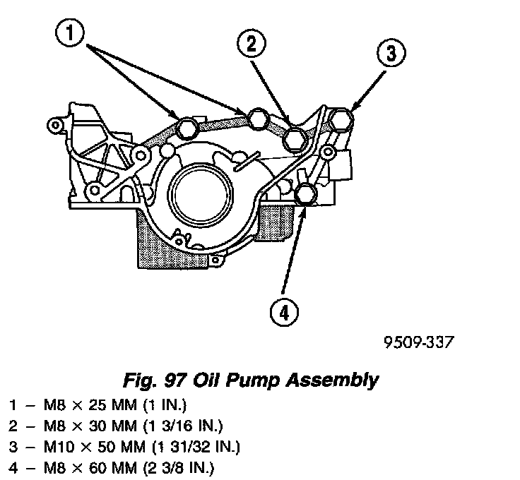 4. Install oil pump slowly onto crankshaft until seated to engine block. Tighten fasteners to M8 bolts 14 Nm (10 ft. lbs.) M10 bolts 41 Nm (30 ft. lbs.). See (Fig. 97) for bolt location and length.
