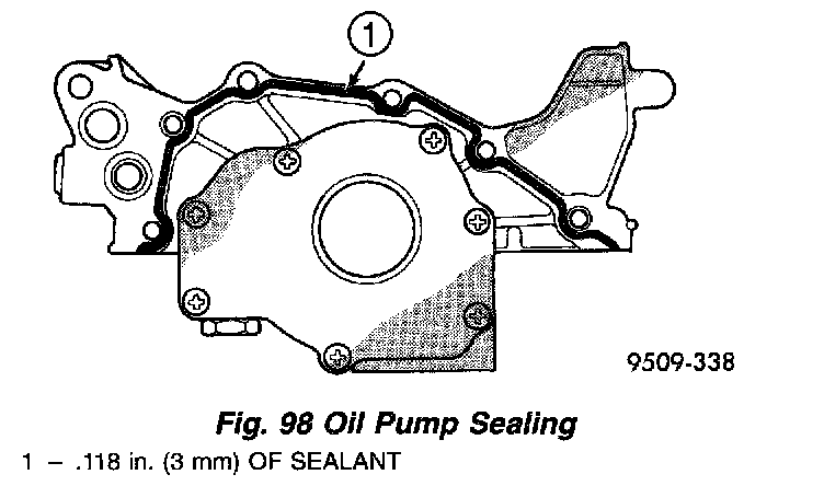 3. Apply Mopar Gasket Maker to oil pump as shown in image. Install oil-ring into the counter bore on the oil pump body discharge passage (Fig. 98).