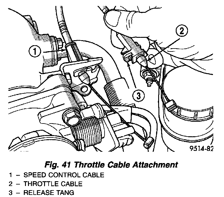 11. Squeeze retainer tab on throttle cable and slide cable out of bracket (Fig. 41).