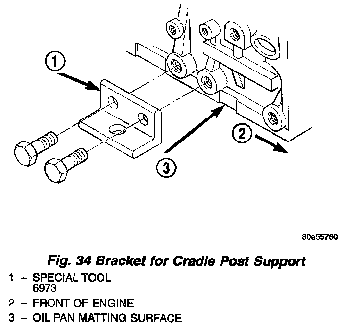 22. Mount Special Tool 6973 bracket, to the right side of the cylinder block (Fig. 34). Align the front adjustable post with the hole in the bracket.