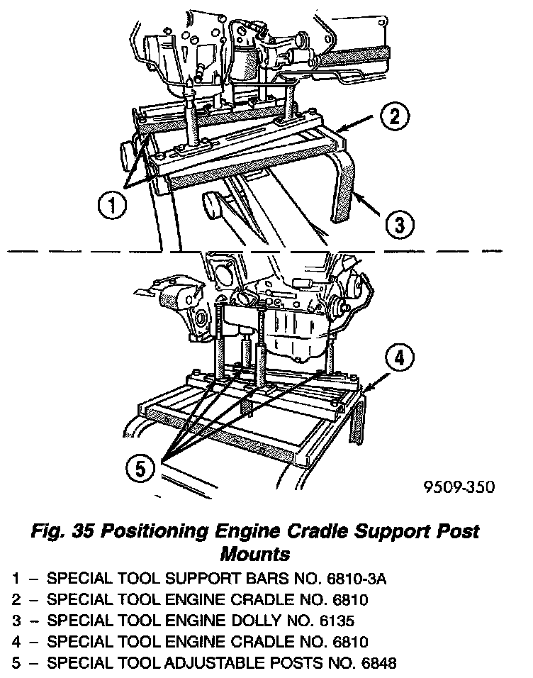 23. Raise vehicle enough to allow engine dolly and cradle Special Tools 6135 and 6710 to be installed under vehicle (Fig. 35).