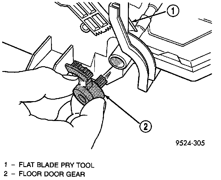 28. From the panel door air opening, using a long thin screwdriver, push in clip for floor door gear. Remove floor door gear.