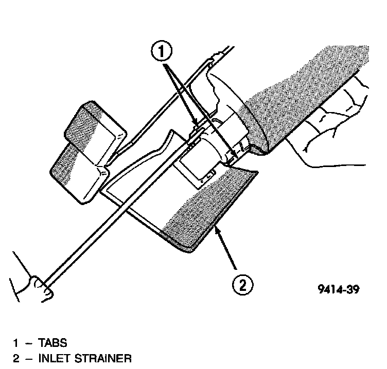 2. Using a thin straight blade screwdriver, carefully pry back the locking tabs on fuel pump reservoir and remove the strainer.