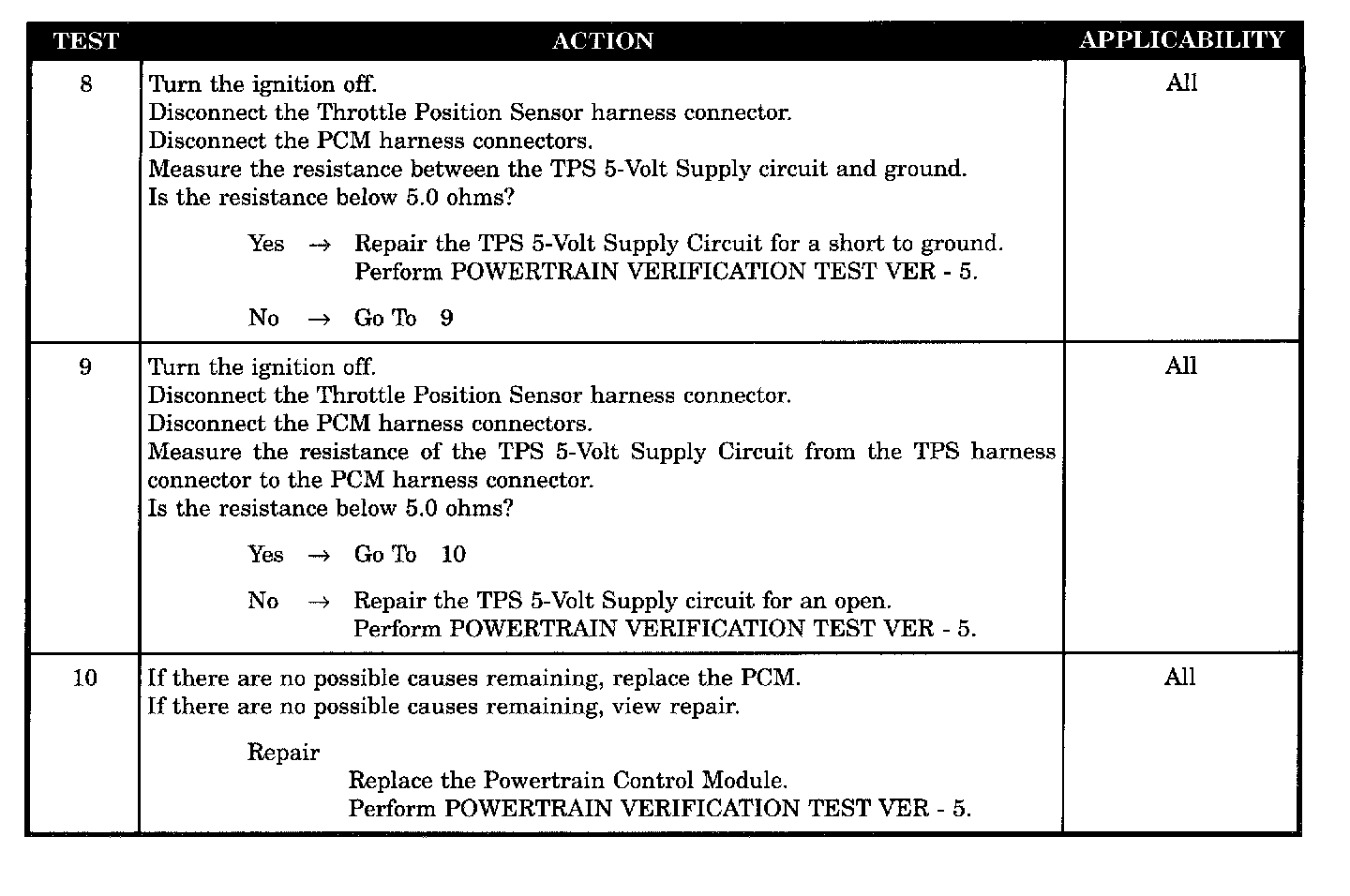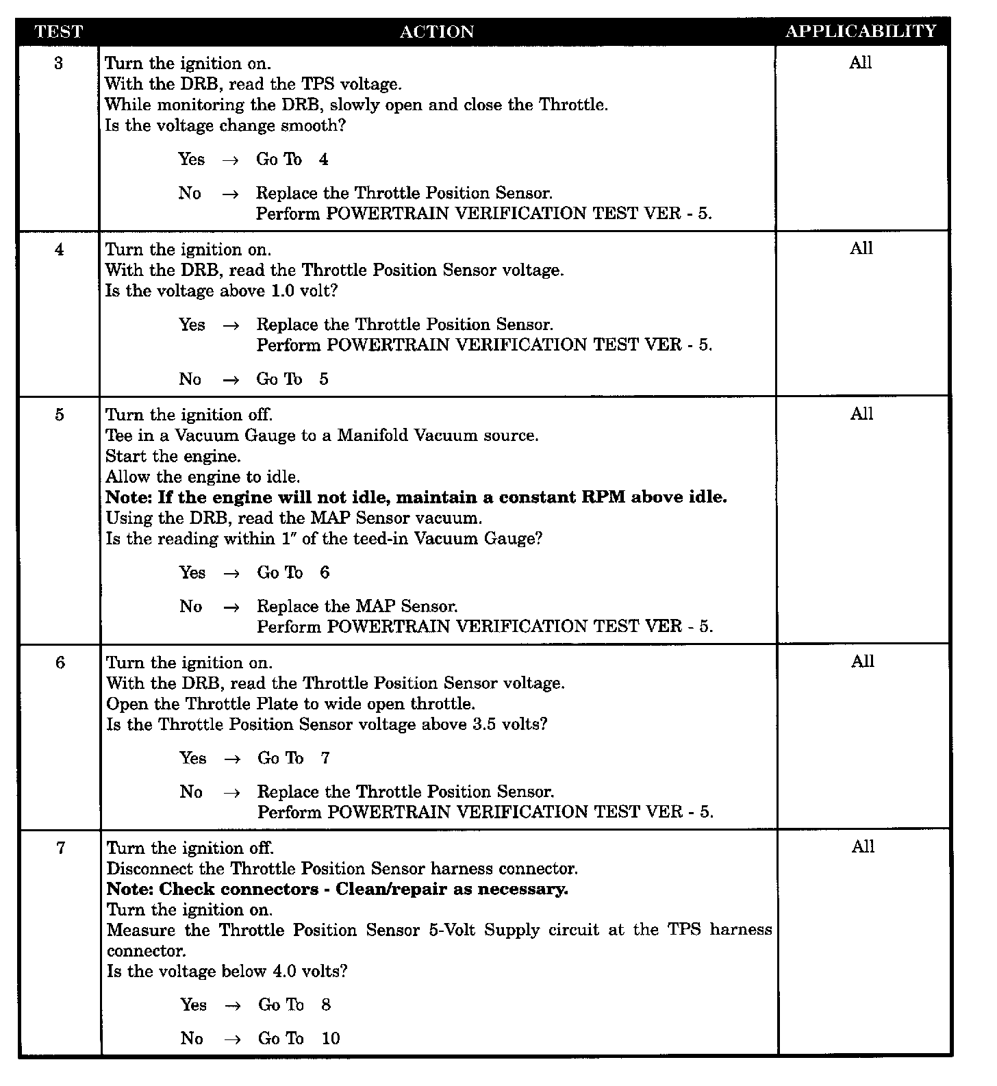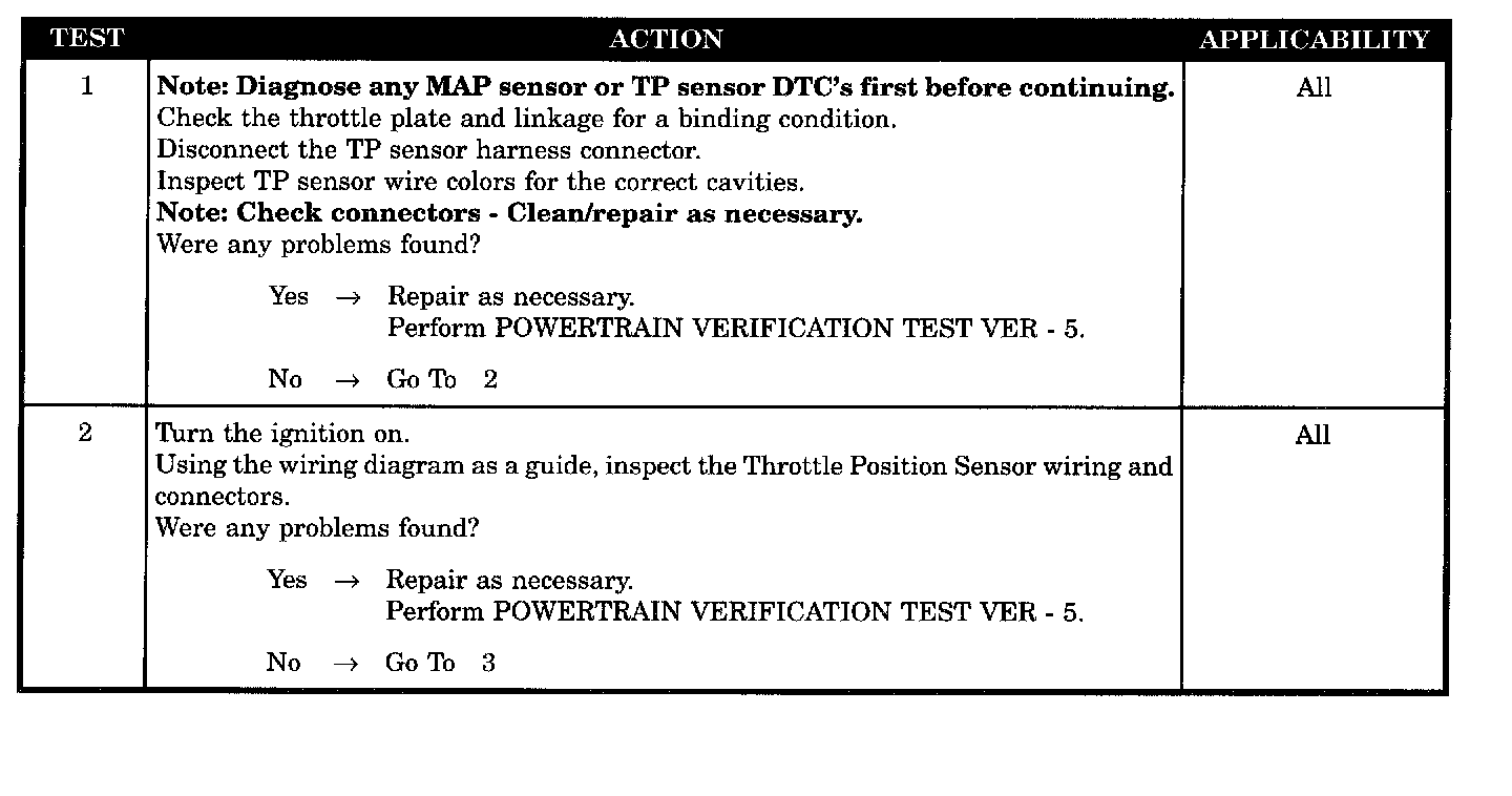 The PCM performs two separate tests. When the manifold vacuum is low, the TPS signal should be high. If the proper TPS voltage is not detected when the two conditions are met, a DTC will be set after 4 seconds.