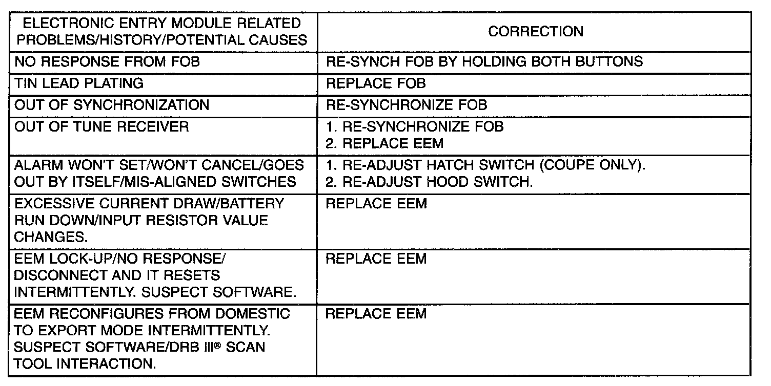The EEM system can communicate with the DRB III (R) scan tool and it is the recommended method for diagnosis. The EEM system does not display any Diagnostic Trouble Codes (DTC's). All of the input switches to the EEM can be read with the DRB III (R) scan tool under the I/O screen. The doors can be unlatched with the DRB III (R) scan tool under actuator tests. If the inputs are OK and the outputs can be cycled with the DRB III (R) scan tool, the problem is most likely the EEM. Refer to the VTSS Diagnosis table for diagnostics and the proper Body Diagnostic Procedures.