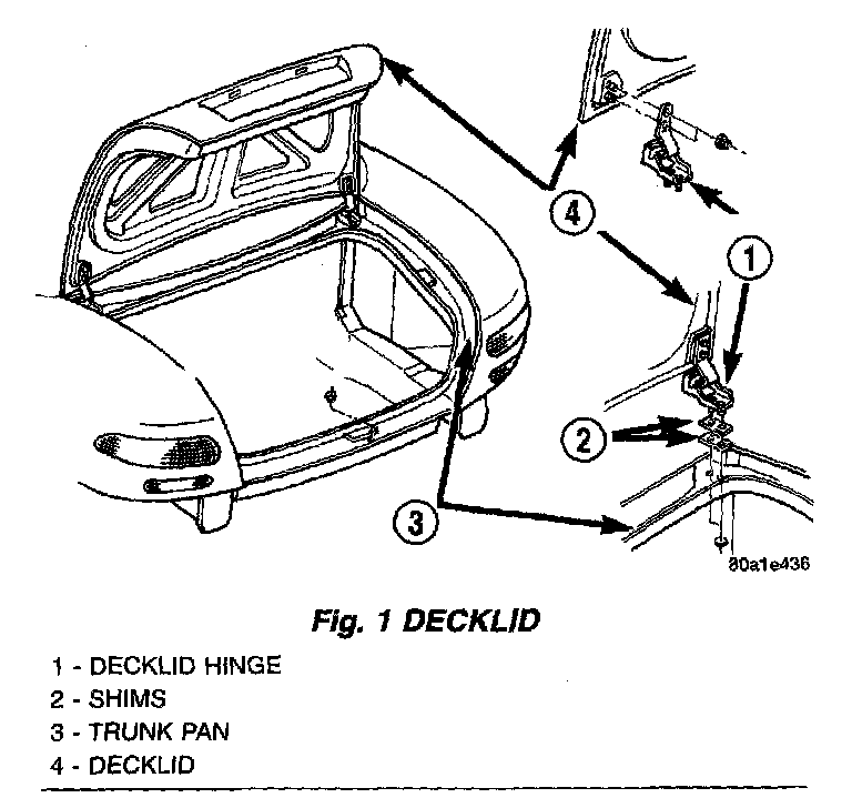 4. With the aid of a helper to support the decklid, remove nuts attaching hinges to decklid (Fig. 1). Retain any shims found between the decklid hinge and the trunk pan.