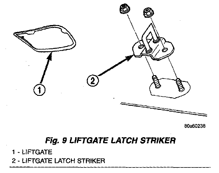 2. Remove nuts attaching liftgate latch striker to liftgate (Fig. 9).