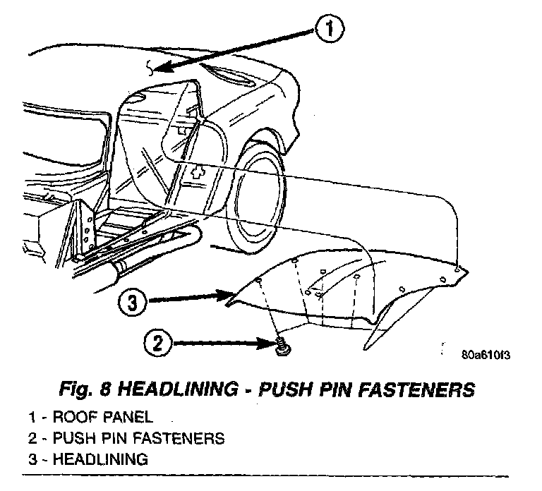 2. Remove push pin fasteners attaching headlining to roof panel at sides of headlining (Fig. 8).