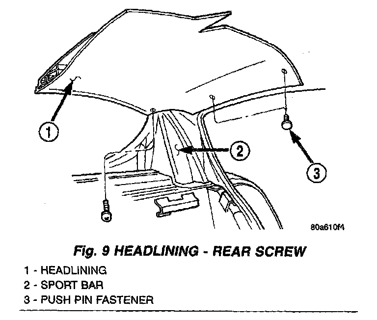 6. Remove screws at rear of headlining attaching headlining to the sport bar (Fig. 9).