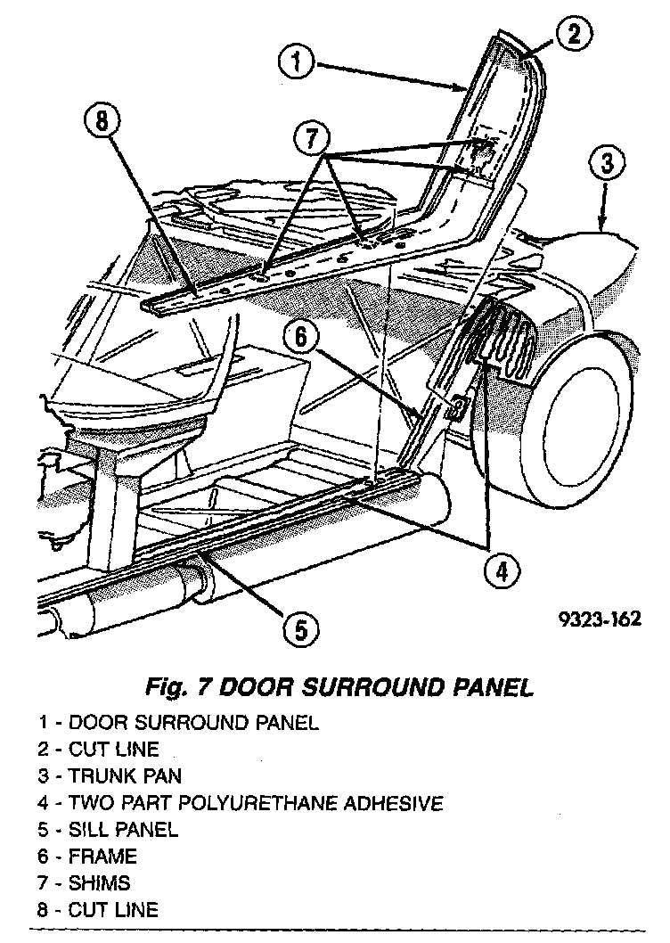 10. Using a 75 mm (3 in.) cut off wheel, cut surround panel along flat surface down latch pillar and sill (Fig. 7).