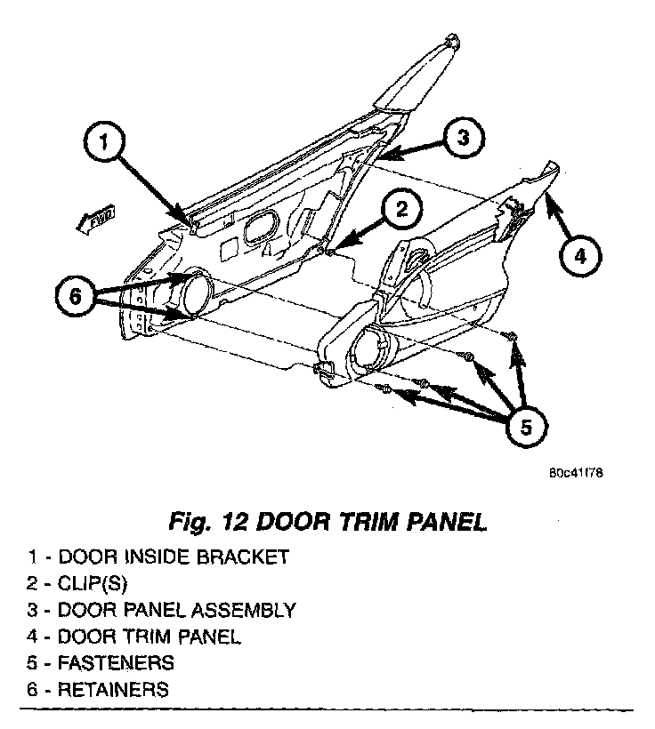 6. Remove screws attaching the trim panel to the inner door panel through the speaker opening (Fig. 12).