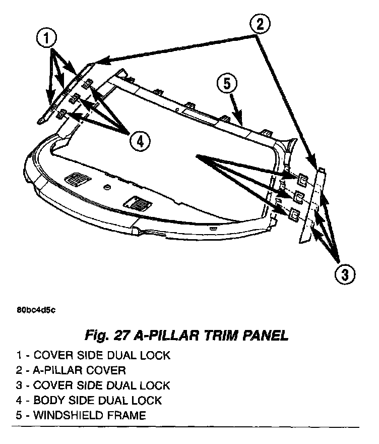 1. Pull outward on bottom portion of A-pillar trim panel to separate trim panel from duo-lock fastener (Fig. 27).