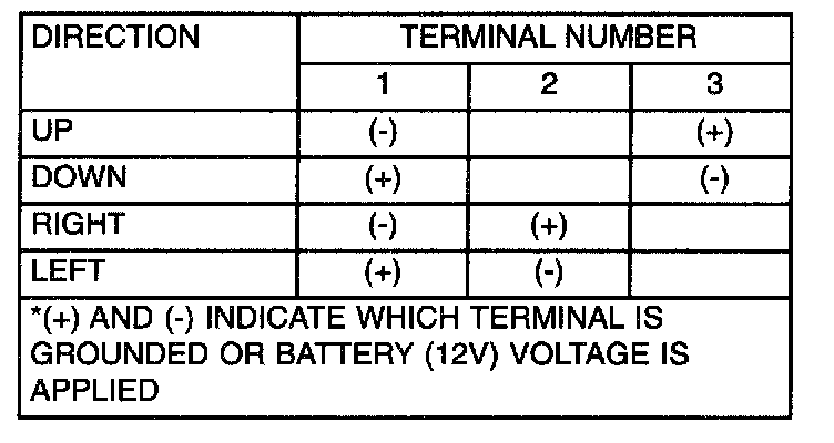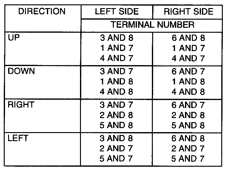 5. Unplug the wire harness connector at the inoperative power mirror. Use two jumper wires, one connected to a 12-volt battery feed, and the other connected to a good body ground. See the Power Mirror Test table for the correct jumper wire connections to the power mirror half of the power mirror wire harness connector. If the power mirror(s) do not respond as indicated in the table, replace the faulty power mirror assembly. If the power mirror(s) do respond as indicated in the table, repair the circuits between the power mirror and the power mirror switch for a short or open as required.