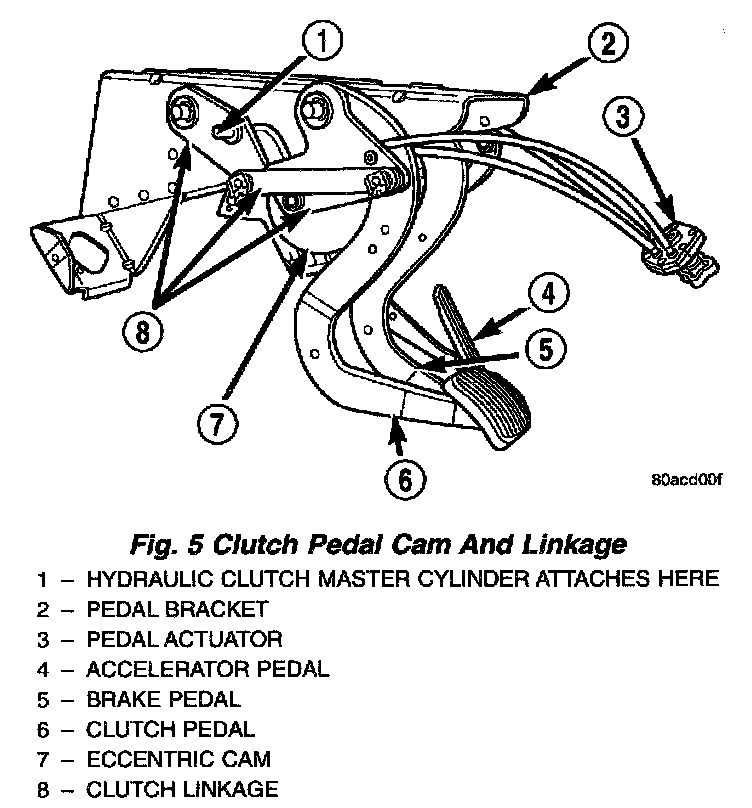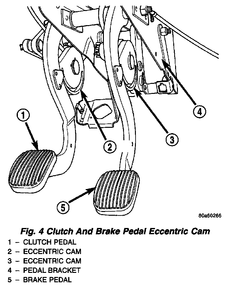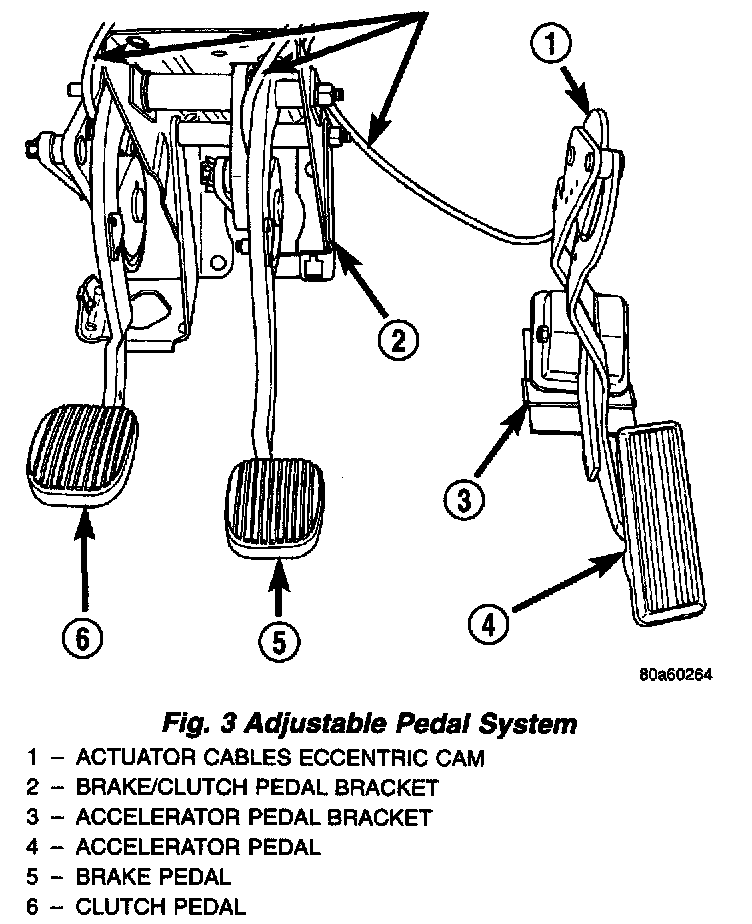 DESCRIPTIONThe brake, clutch and accelerator pedals used in this vehicle are adjustable. All three pedals can be adjusted fore-and-aft four inches. Once the driver's seat has been adjusted to the correct driving position for the drivers upper body, the pedals can be adjusted to accommodate for differences in the length of the driver's leas.