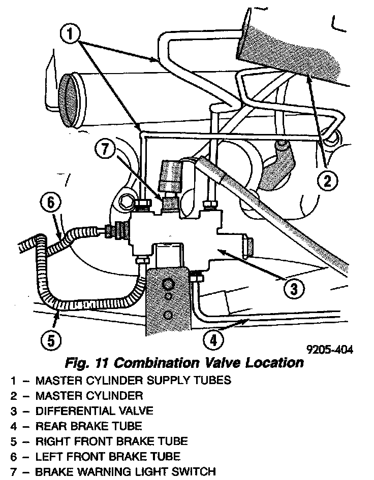 DESCRIPTIONThe combination valve is attached to the frame rail below and forward of the master cylinder. It has five fluid ports and a brake lamp warning switch on its exterior. Internally it has a pressure differential valve and a single proportioning valve.