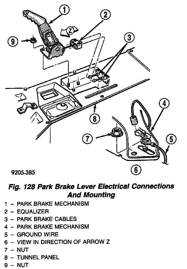 1. Install parking brake lever mechanism over mounting studs in tunnel panel. Install the 3 mounting nuts attaching park brake mechanism to tunnel panel. Install the ground wire between rear park brake mechanism and the mounting nut. Tighten the 3 park brake mechanism mounting nuts to a torque of 29 Nm (250 inch lbs.).