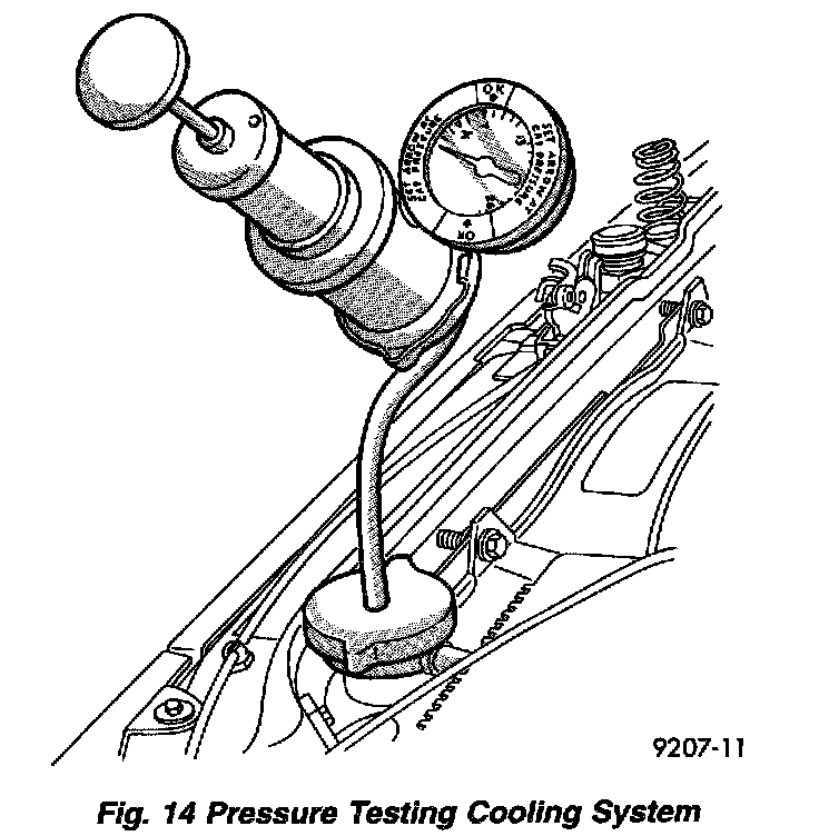 Attach the Cooling System Tester 7700 or equivalent to the radiator, as shown, and apply 104 kPa (15 psi) pressure. If the pressure drops more than 13.8 kPa (2 psi) in 2 minutes, inspect all points for external leaks.