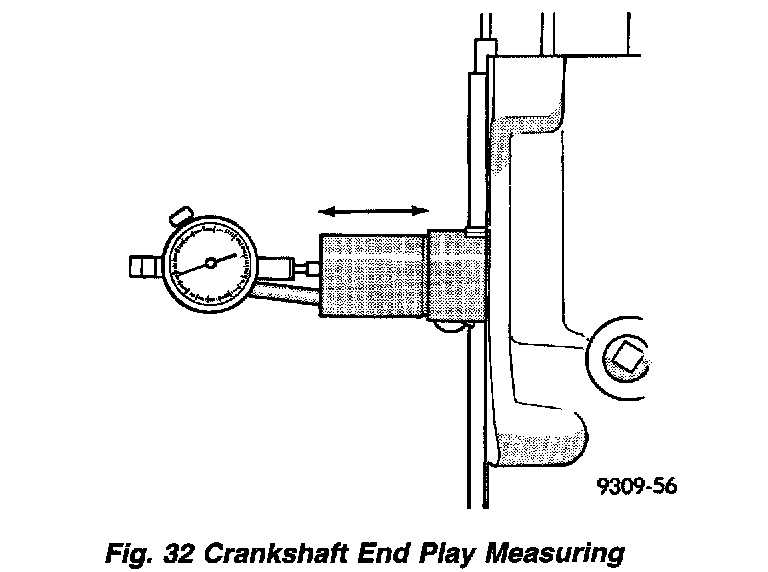 (1) Mount a dial indicator to front of engine, locating probe on nose of crankshaft (Fig. 32).