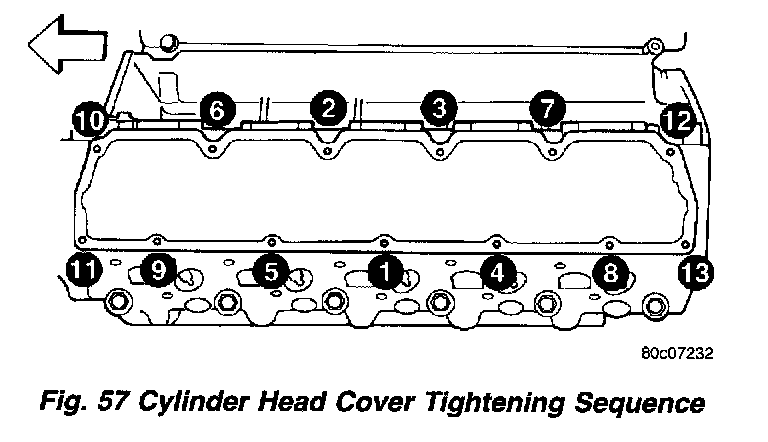 (1) Place cylinder head cover gasket onto the cylinder head. Install cylinder head cover onto the cylinder head and tighten fasteners to 11 Nm (95 in. lbs.) in sequence shown in (Fig. 57).