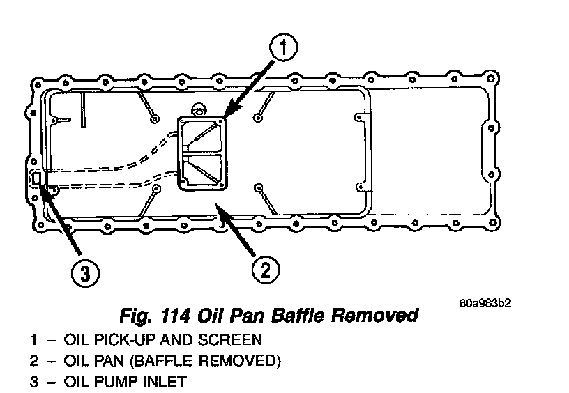 Clean oil pan in solvent and wipe dry with a clean cloth. Clean all gasket material from mounting surfaces of pan and block. Remove oil pan baffle and screen. Clean passage from oil pick-up to oil pump inlet (Fig. 114).