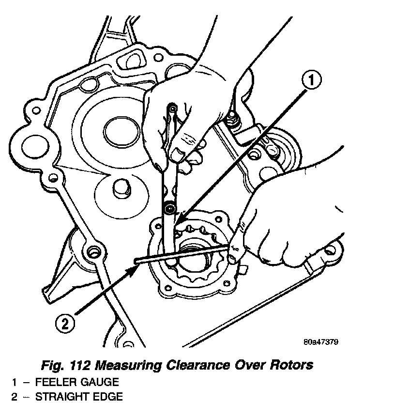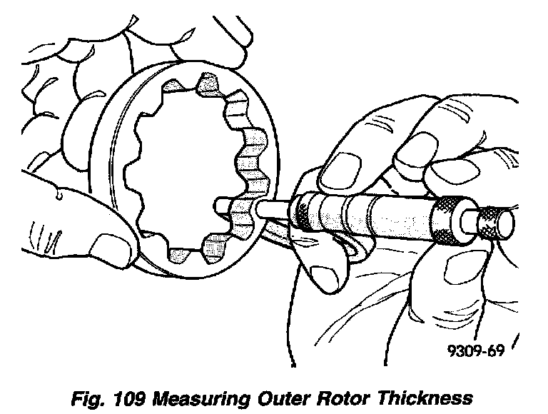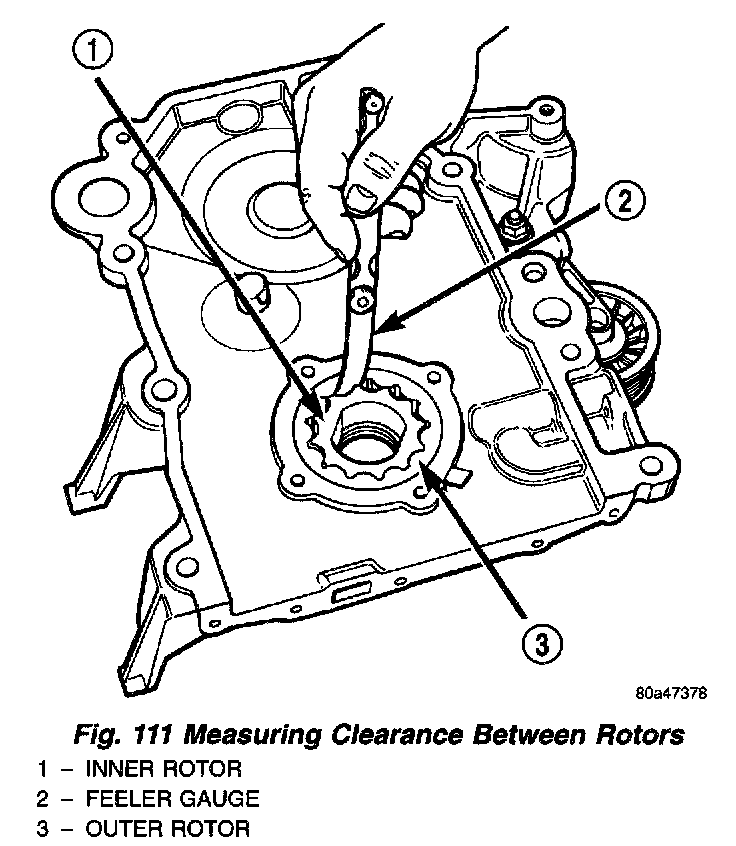 (4) Install inner rotor into case cover. If clearance between inner and outer rotors (Fig. 111) is 0.150 mm (0.006 inch) or more, replace rotor set.